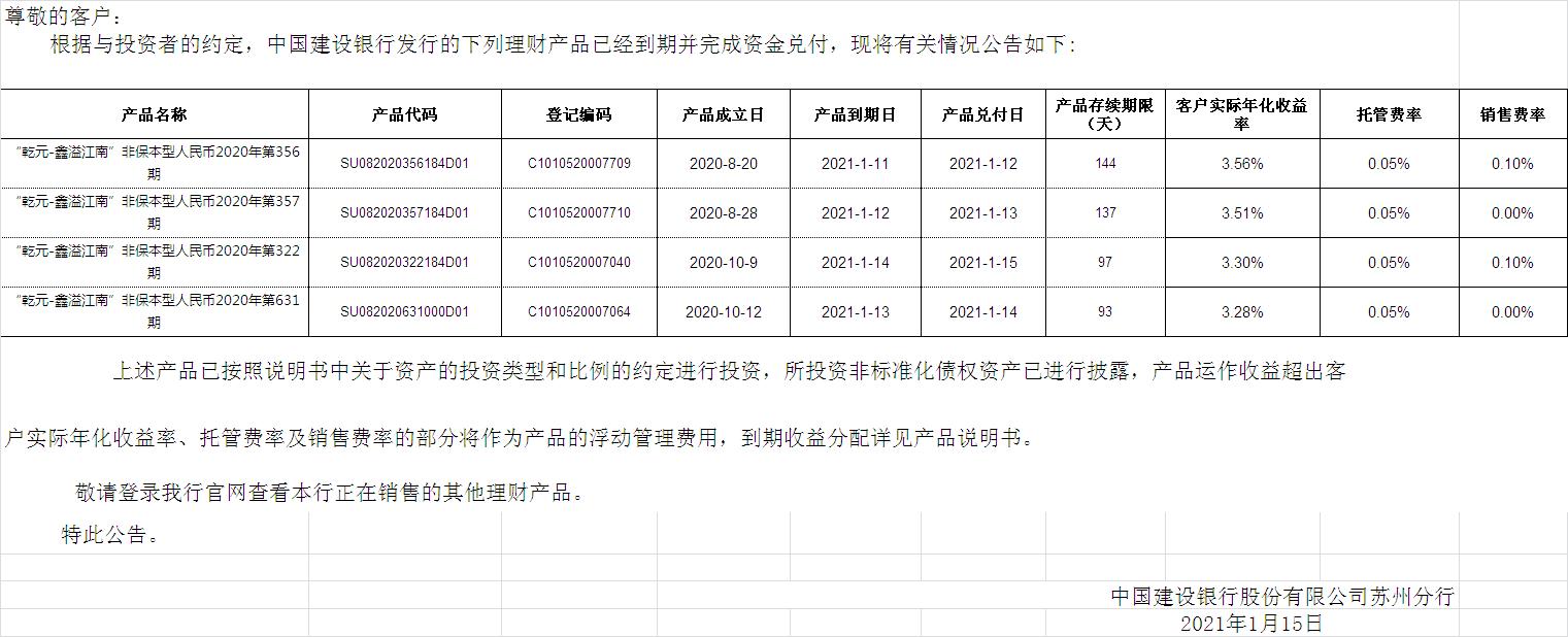 中国建设银行理财产品终止及清算公告